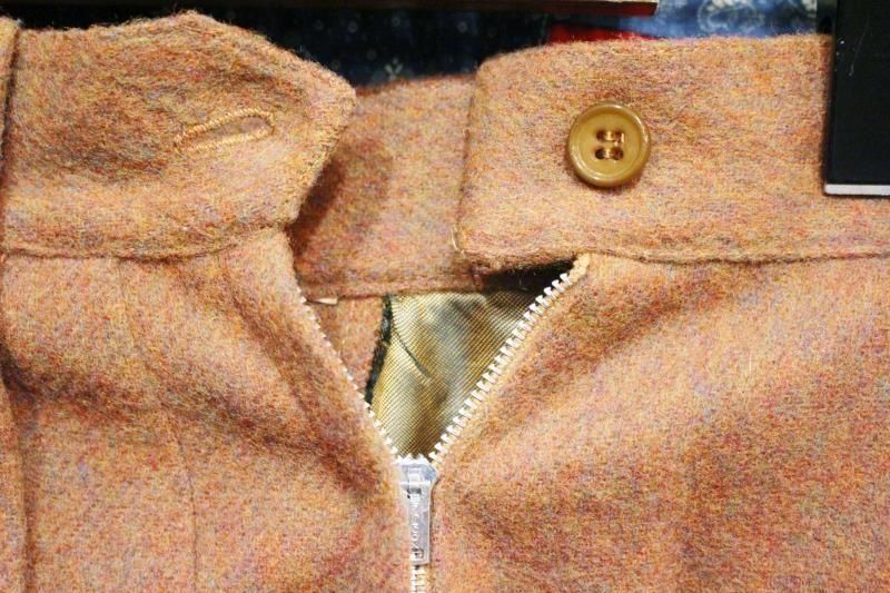 左サイドにボタンとジッパーが付いており、裏地はヒップ側にだけ付くタイプです。