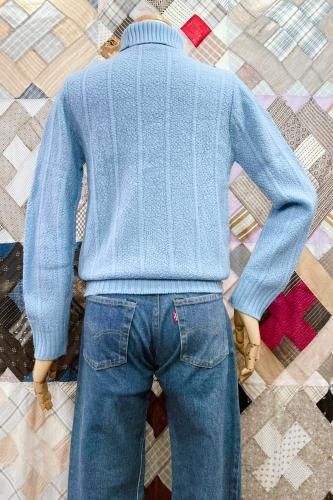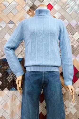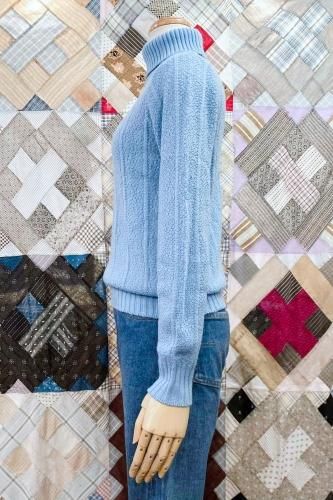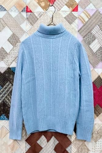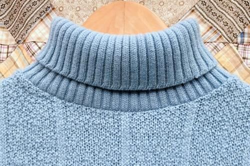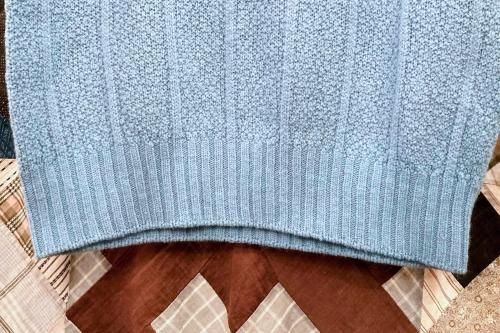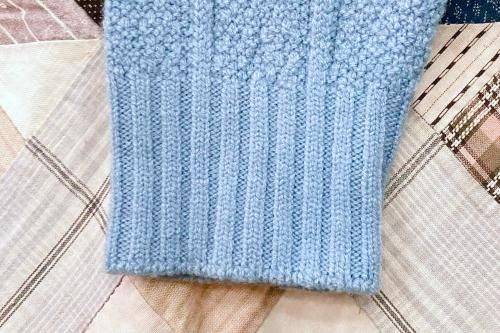 ランダムな編みでラインが入っており、ネックと袖口と裾がリブになっています。